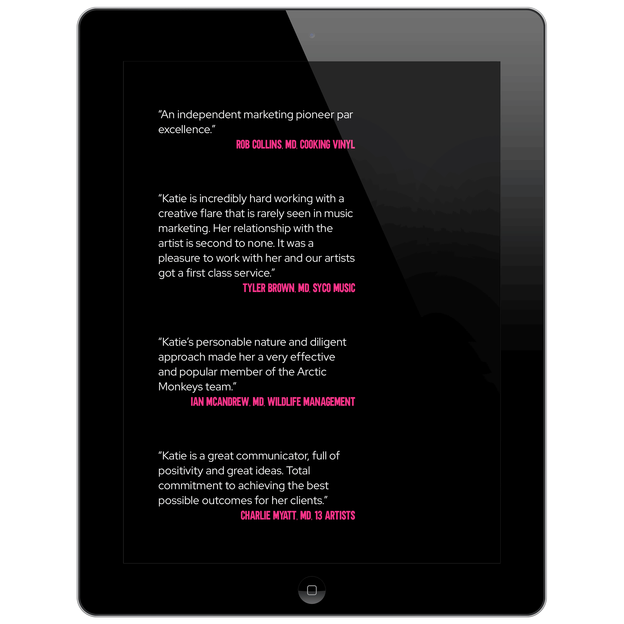 Katie was looking for a simple site as a calling card for her music marketing business. She wanted it to be clean and fun to show her unique style. We took the colors she had already been working with in her marketing materials and gave the site a punch with the pink on black.