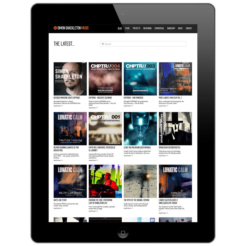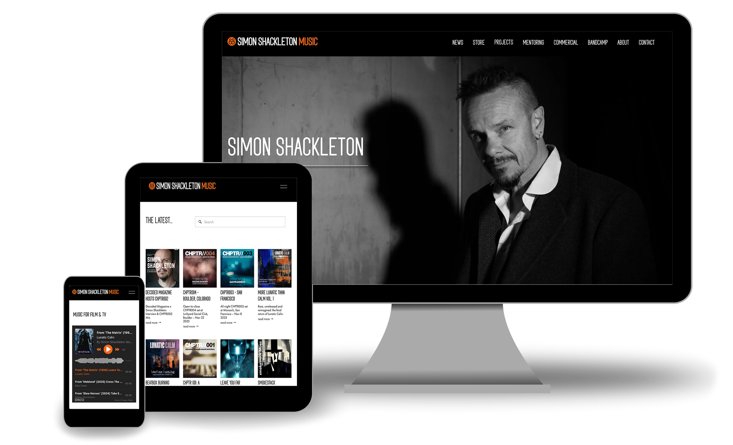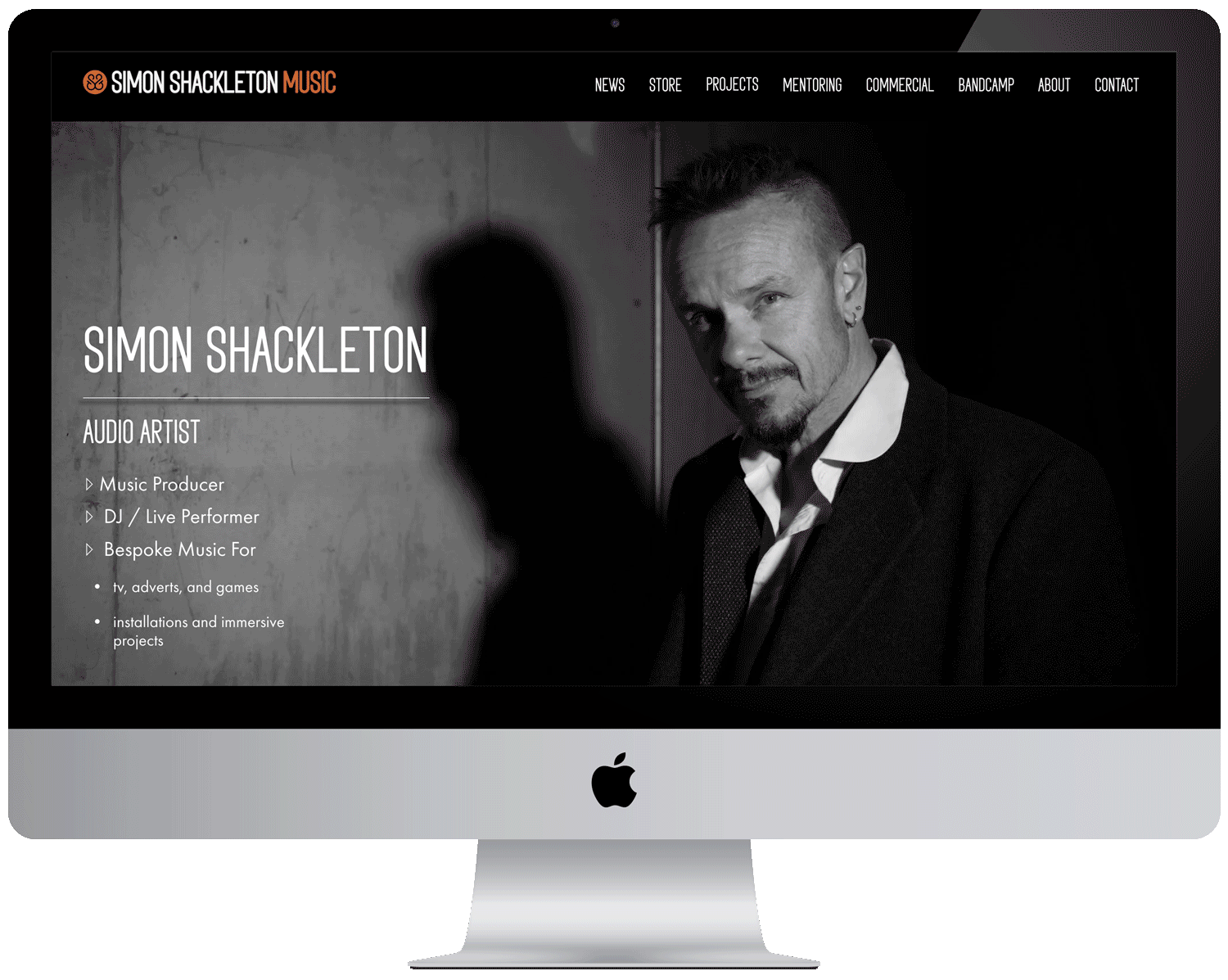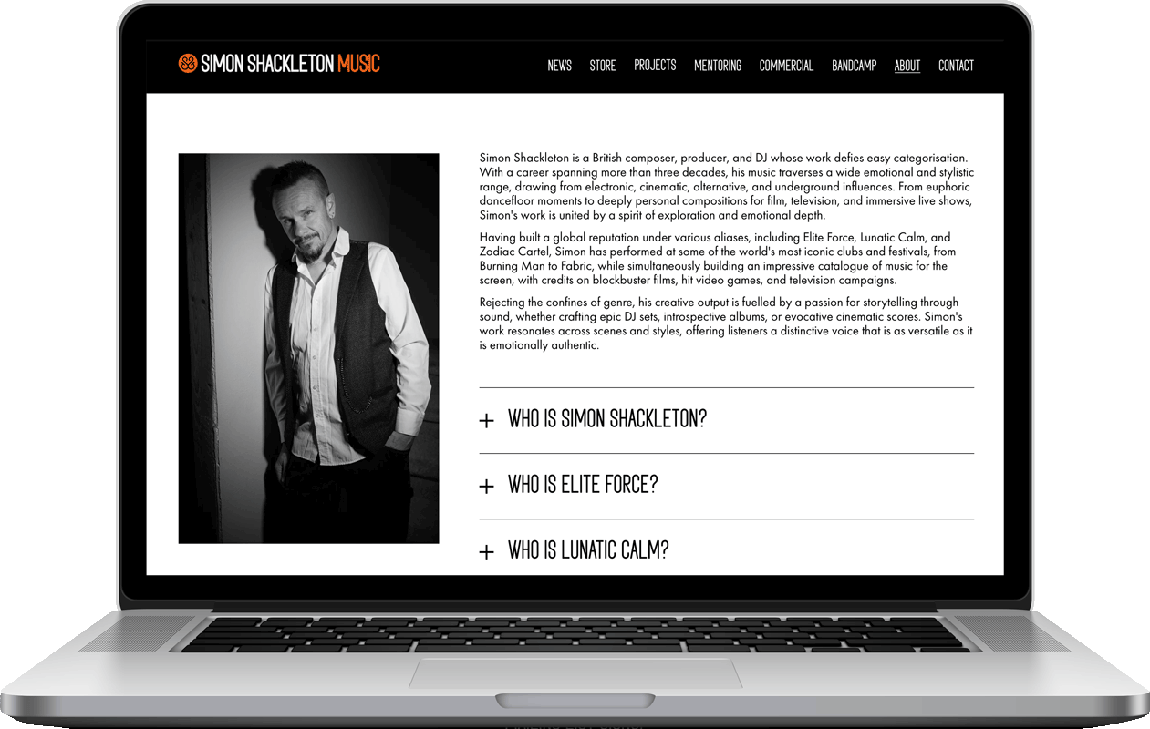 Simon Shackleton has a long history in the music industry. He’s traveled the world as a DJ, and as a music producer creates music for bespoke installations & projects, film, tv and adverts, and is pushing into the live show arena again. We created a multi-functional site that both showcases his illustrious past and pushes his newest directions.