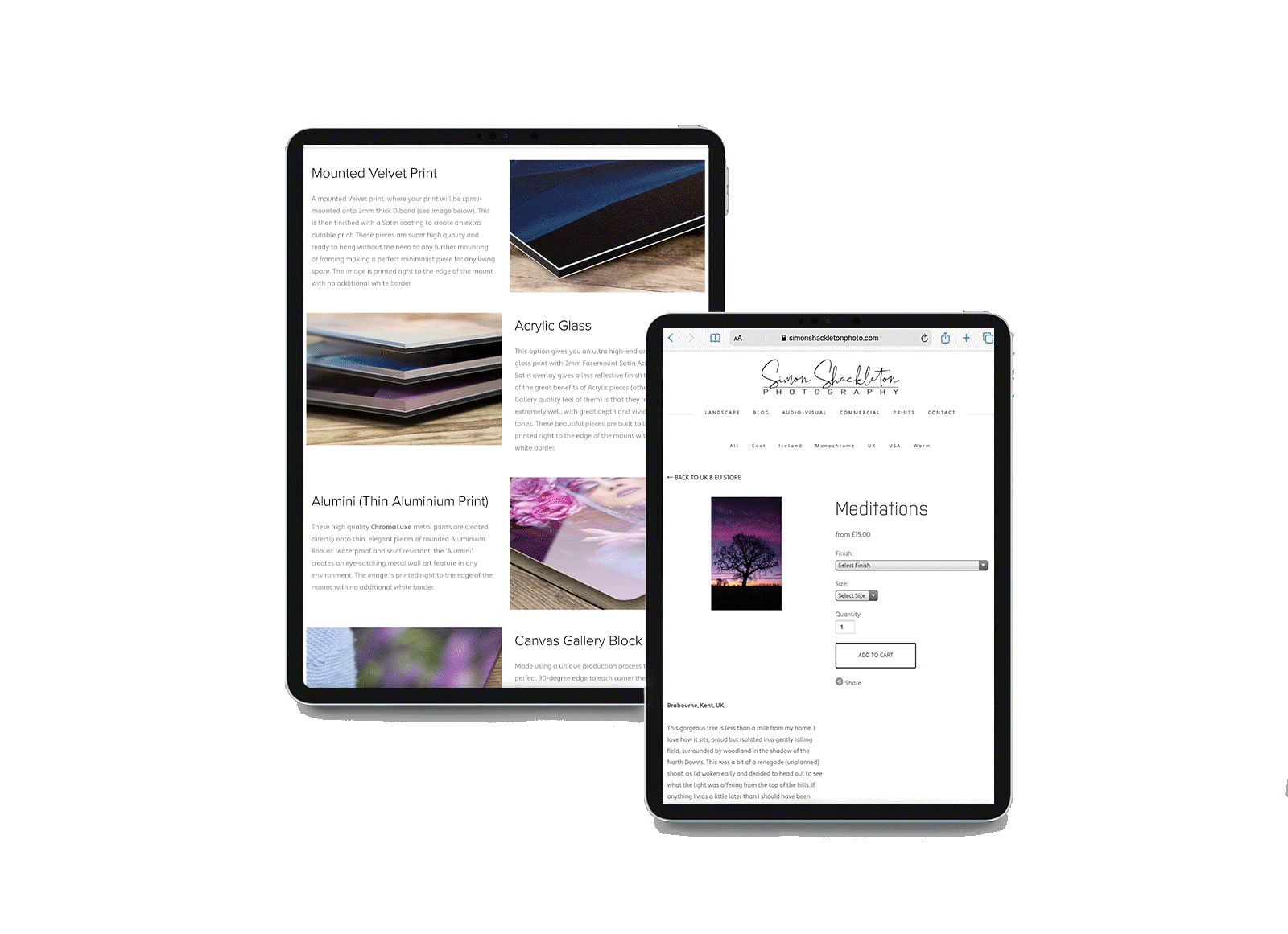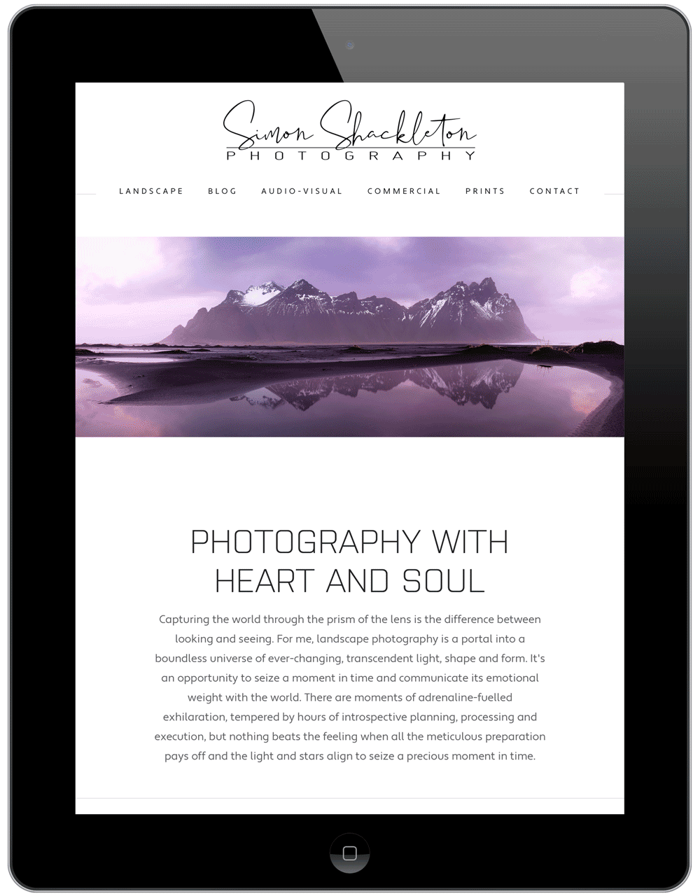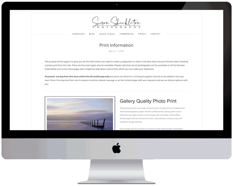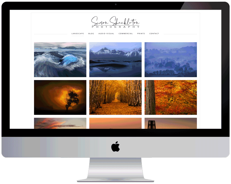 Simon Shackleton is a landscape photographer who wanted a functional sales outlet, a place to write about his experiences while out in the field and a space to display his work. Because his photos are colorful and visually stunning in themselves, we made a clean, minimal site to make the images pop.